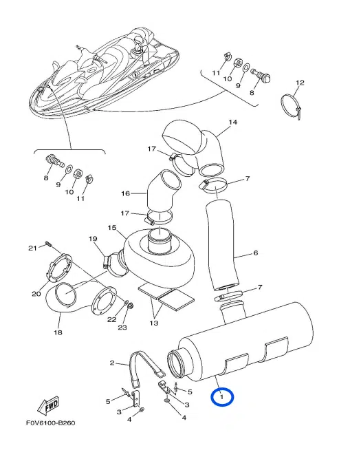 Silencieux d’échappement – Water Lock Comp Yamaha 1200 cc 1999-2005 référence F0D-67550-00-00, F0D-67550-01-00, F0D-67550-03-00