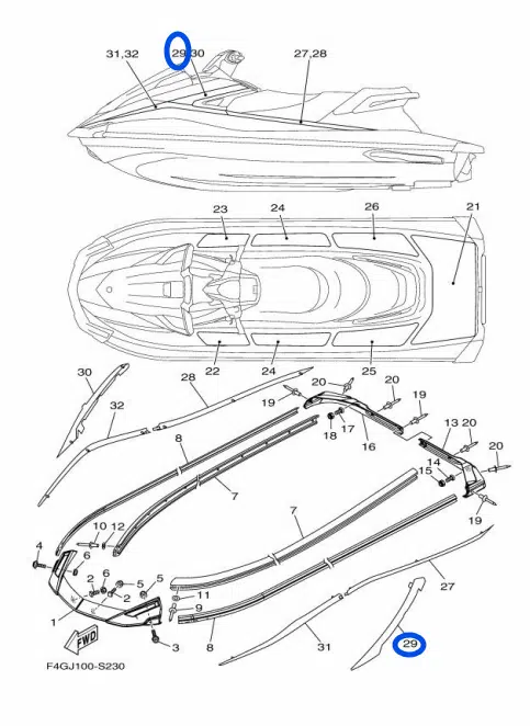 Enjoliveur latéral gauche – Ornament Side LH Yamaha GP-VX 1050-1800cc 2018-2020 référence F3P-U377F-20-00